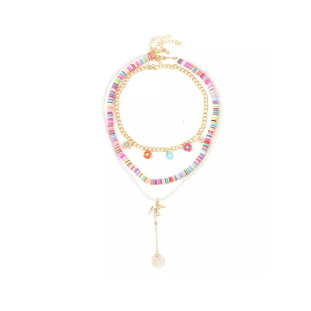 Deze 3-dubbele ketting bestaan uit een kralen kettinkje, een ketting met kralen bloemetjes en een lange ketting met een muntje en vogeltje eraan.