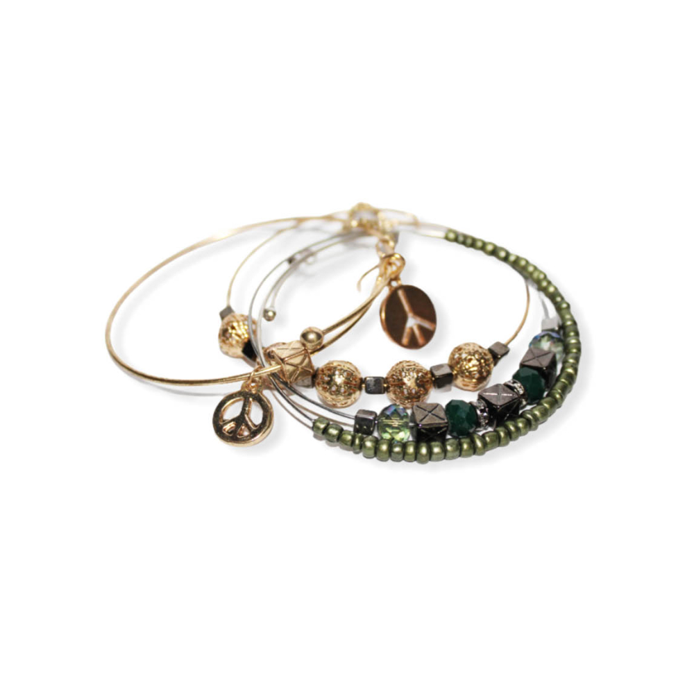 Deze stoere armband bestaat uit 4 metalen ringen met daaraan kralen. Vier metalen ringen met kralen en bedeltjes van peace tekens. De armband kun je open doen door het metalen klik systeempje.