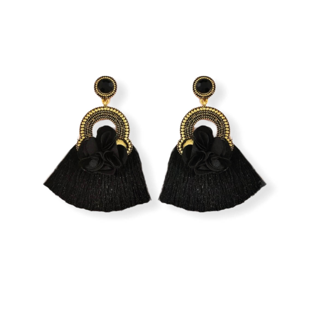 De grote oorbellen zijn een echte eye catcher. De druppel oorbellen hebben een roze kwastje en een bloemetje.