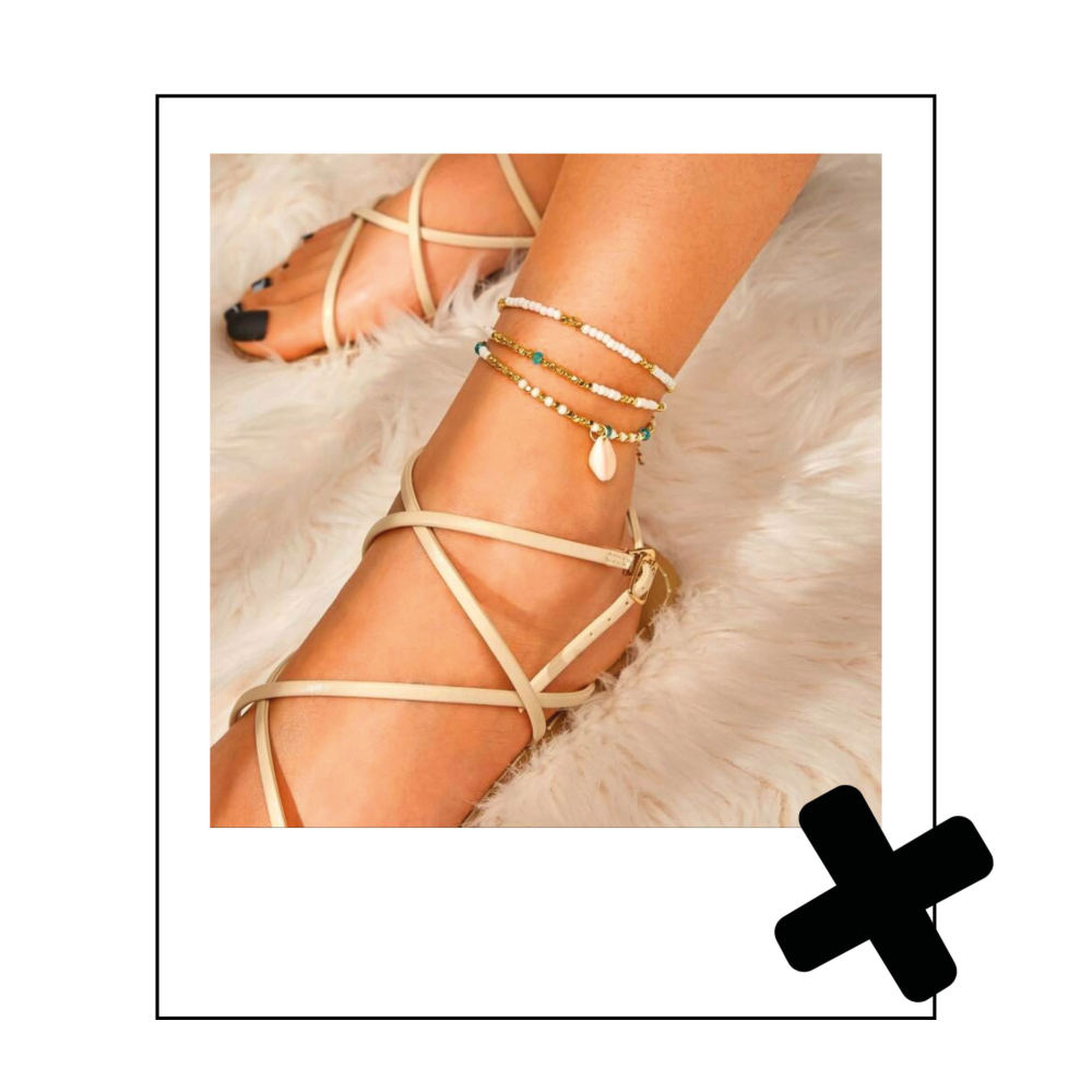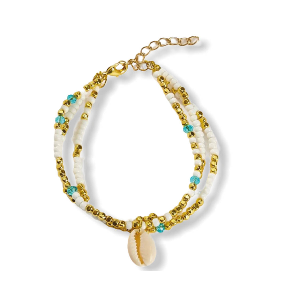 3 enkelbandjes die aan elkaar zitten. Aan het bandje zit een schelpen bedeltje en het bandje is bekleed met goudkleurige,witte en blauwe kraaltjes. Het enkelbandje is verstelbaar en helemaal leuk voor de zomer!