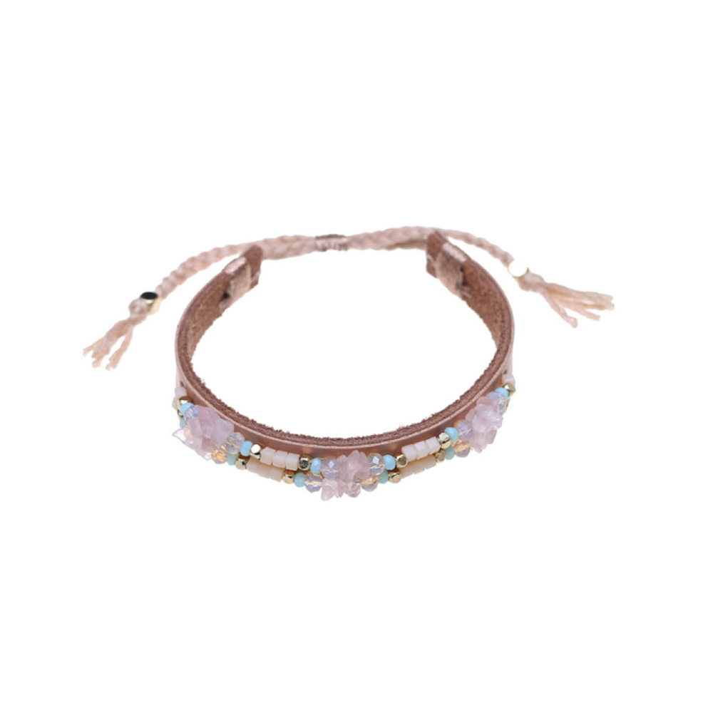 Ibiza stijl! Deze leren armband is verstelbaar door te trekken aan de touwtjes. De armband is bekleed met kraaltjes en diamantjes en is super hip!