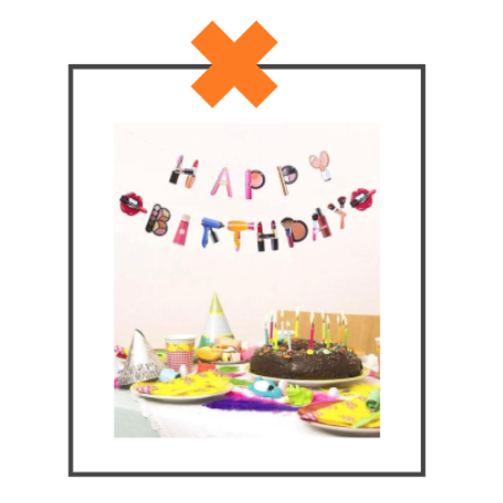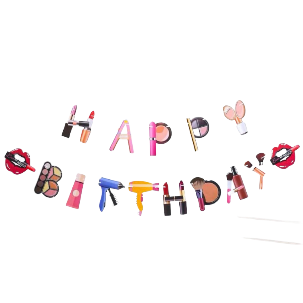 Super leuke papieren slinger met lipsticks & andere make-up. Het DIY pakket bestaat uit 1 slinger: met letters happy birthday, lippen en een satijnenband .